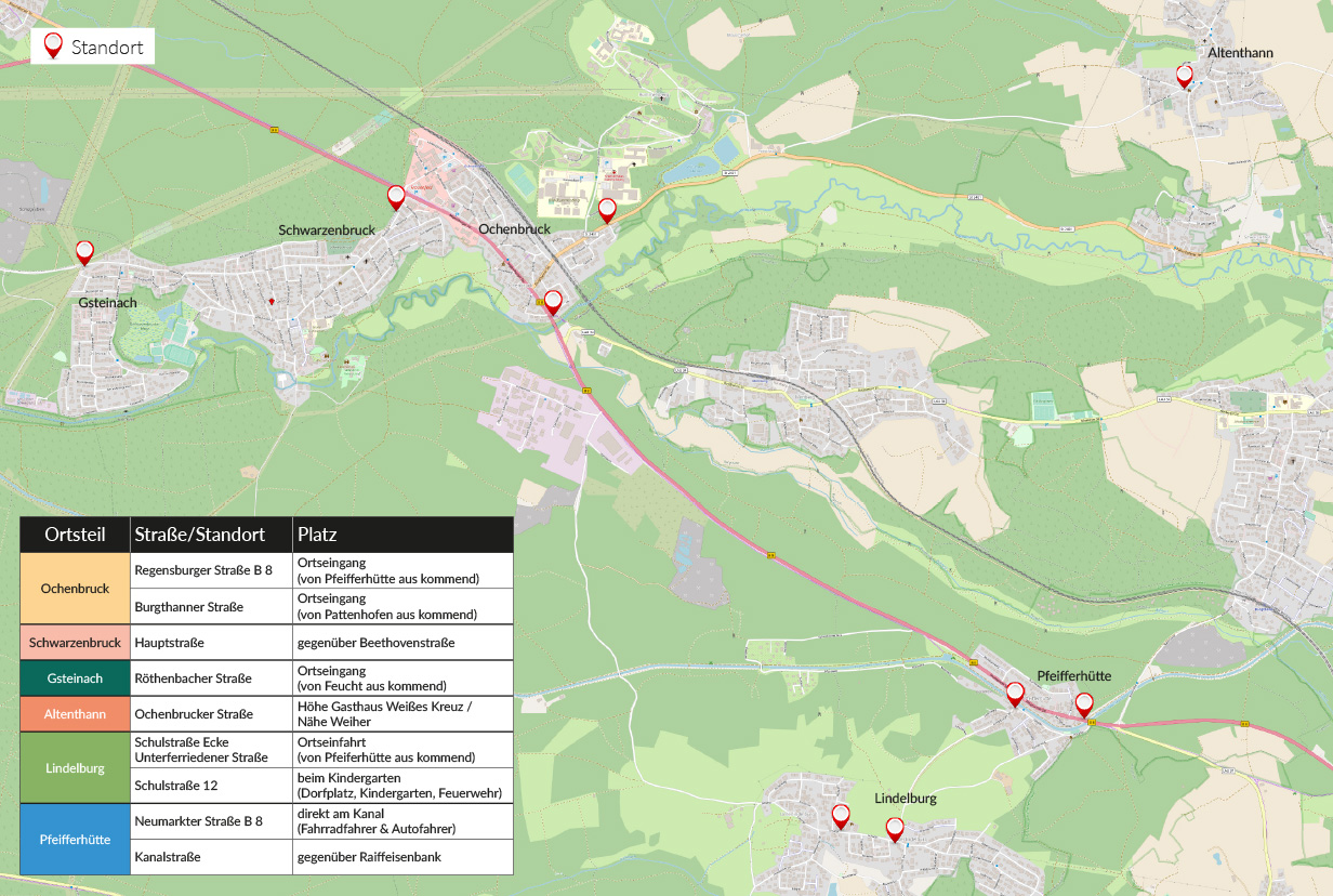 | Ochenbruck | Regensburger Straße B 8 | Ortseingang (von Pfeifferhütte aus kommend) |